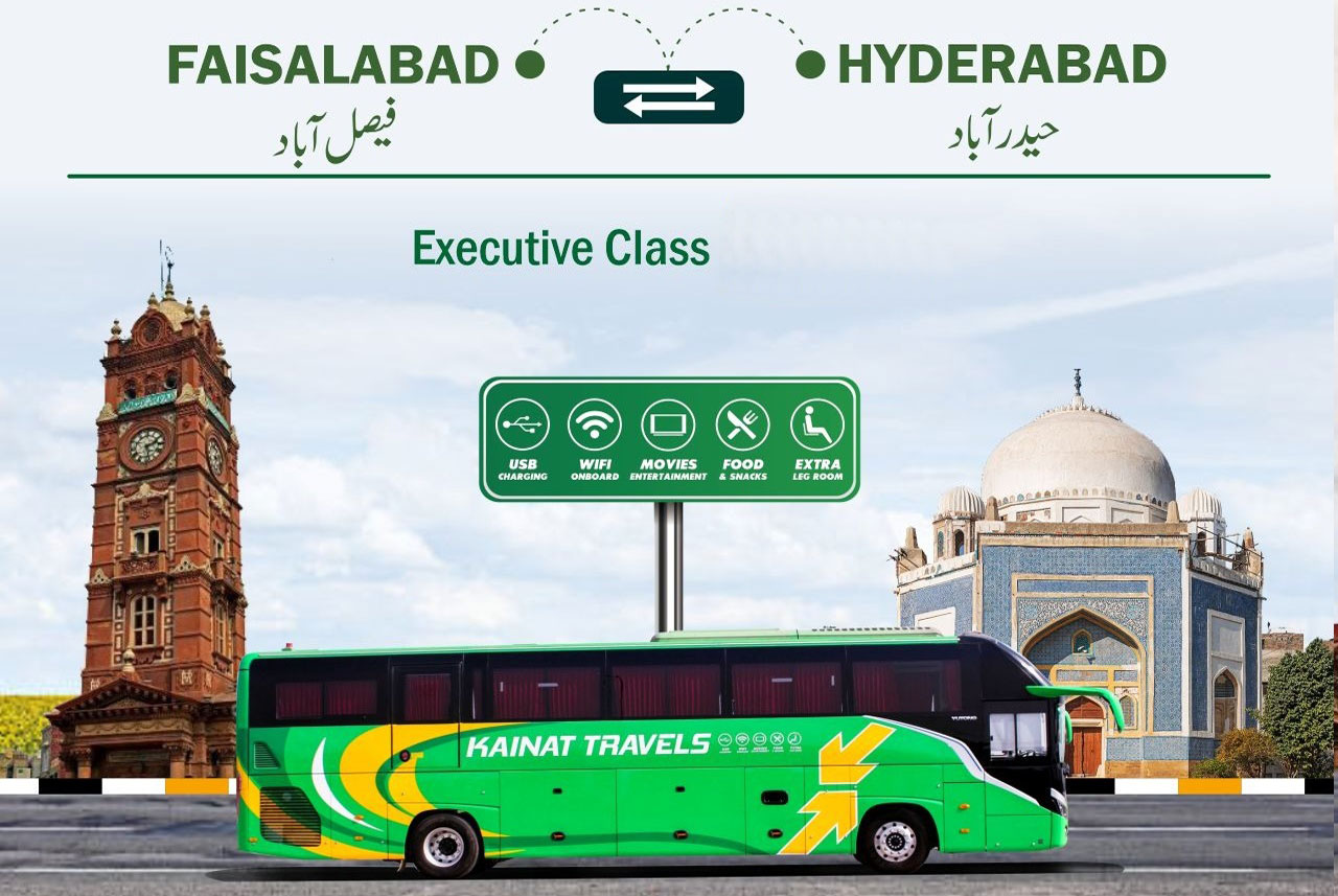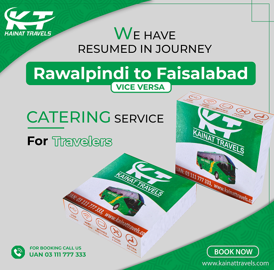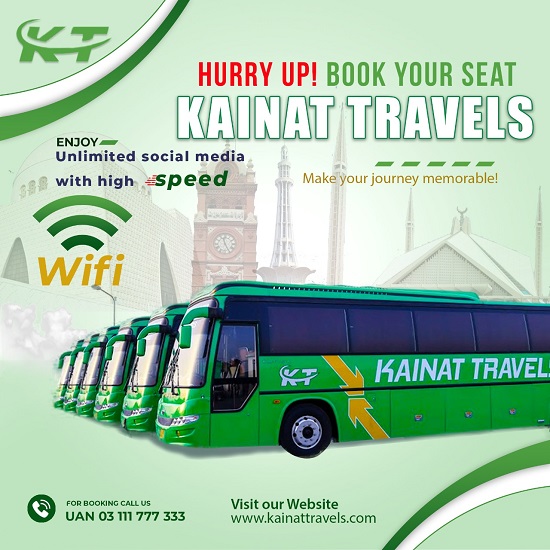Kainat Travels bestow one of the reputed travelling services in Pakistan with their restful seats and hygenic refreshment.