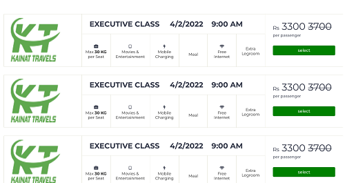 Kainat Travels offers their passengers free wi-fi, refreshment during the journey.